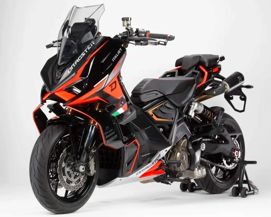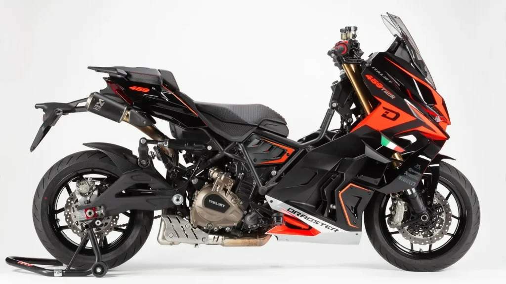 Italjet Dragster 459 is produced in 2026. Engine is Four stroke, parallel twin, DOHC, 4 valve per cylinder, displacement 449 cc / 27.4 cu-in , produces power 47 hp / 35 kW @ 9500 rpm and 40.7 Nm / 30 lb-ft @ 8000 rpm. Italjet Dragster 459 wet weight is 180 kg / 397 lbs. Italjet Dragster 459 has 5 photos.